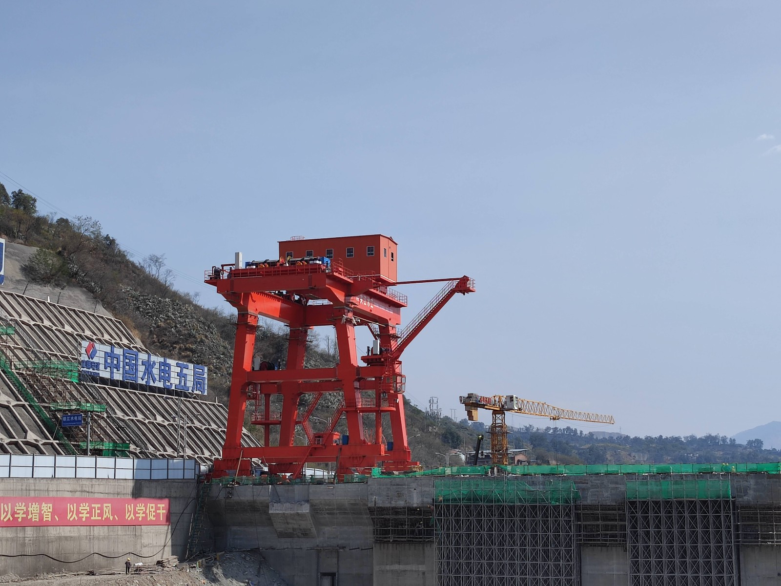 紅色門機(jī)迎江矗立?!按蟮踯囌鎱柡Γ賴嵲O(shè)備輕而易舉提抓起來!”今年以來,攀枝花廣大市民陡然發(fā)現(xiàn)銀江水電站大壩上架起了一個(gè)紅色的大型設(shè)備,從幾公里外的市區(qū)一眼望去就能映入眼簾,成為銀江水電站的新標(biāo)志。這個(gè)紅色巨物就是壩頂門機(jī),高25米,寬16米,最大起吊能力達(dá)到500噸,起升高度達(dá)75米。是水電站建設(shè)期金屬結(jié)構(gòu)安裝及后期電站運(yùn)行最重要的設(shè)備之一,2024年將肩負(fù)起包括36扇閘門在內(nèi)共計(jì)超萬噸的設(shè)備起吊任務(wù)。為順利推進(jìn)施工,開年以來,川投能源攀水電公司通過增加臨時(shí)軌道提前籌備、堅(jiān)持春節(jié)不停工等措施,加快實(shí)施壩頂門機(jī)供貨安裝,計(jì)劃4月中旬投入使用。