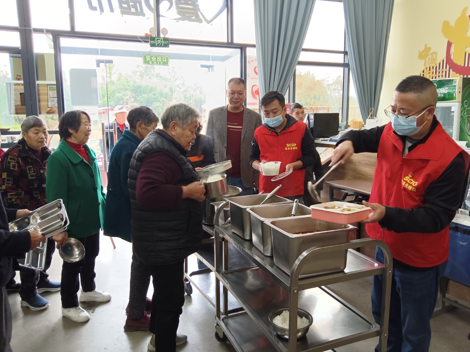 井然有序的活動(dòng)現(xiàn)場(chǎng),身著醒目紅色馬甲的黨員們迅速分工、密切合作,有的拿起掃帚、拖把和抹布開(kāi)展衛(wèi)生清潔,從地面到墻面、從桌椅到餐具的每一個(gè)角落,為老人們營(yíng)造整潔舒適的就餐環(huán)境;有的為行動(dòng)不便的老年人及時(shí)送餐上門(mén),讓他們能心情愉悅地享用美食;有的則陪伴在老人身邊與他們親切交談,關(guān)愛(ài)他們的健康與需求,傾聽(tīng)他們的心聲與故事。“爸媽食堂”內(nèi)忙碌穿梭的黨員身影,構(gòu)成了一幅幅溫馨動(dòng)人的畫(huà)面。