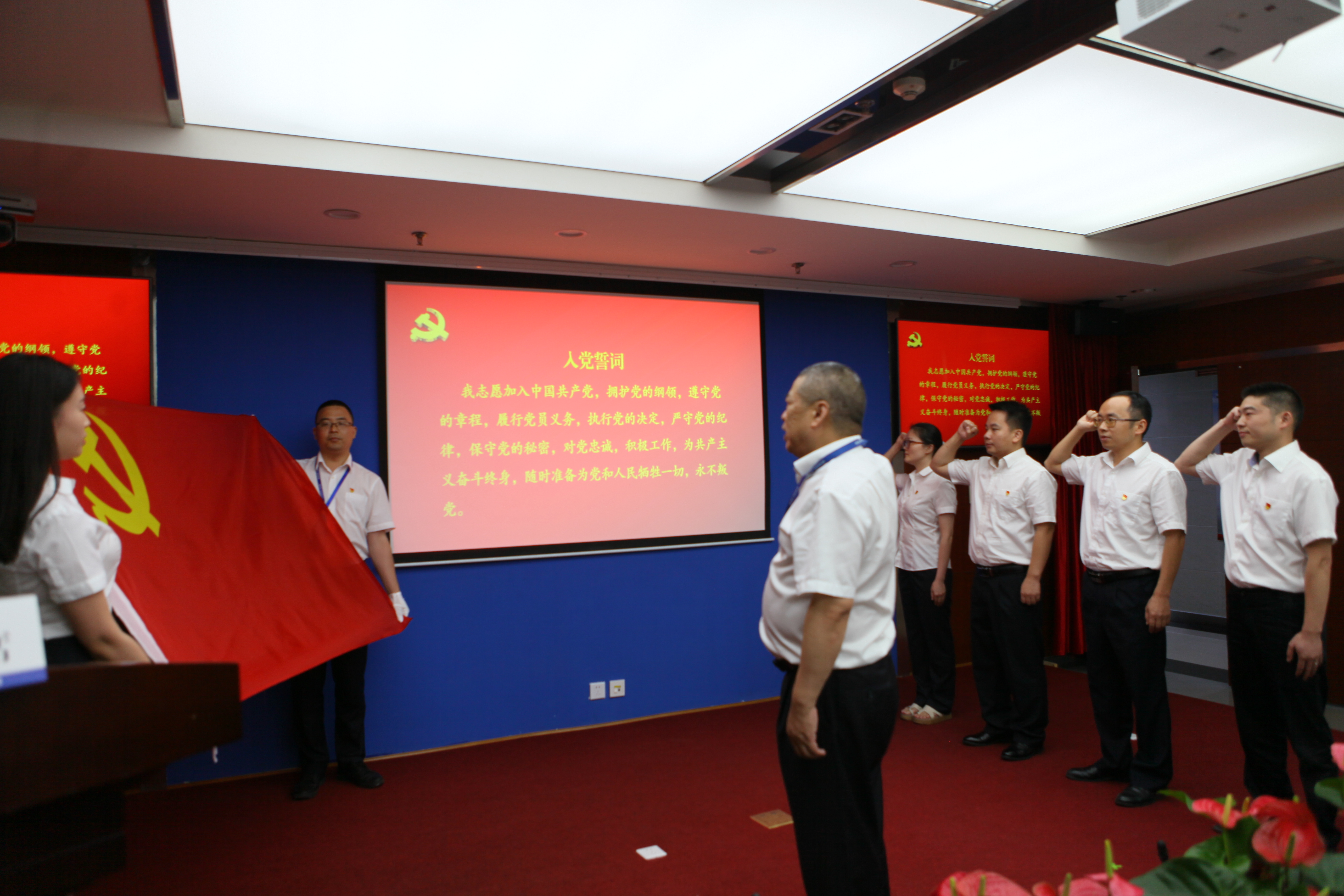 會(huì)議在雄壯的國歌中拉開序幕。與會(huì)黨員和新黨員代表在公司黨委書記、副董事長、總經(jīng)理?xiàng)詈橥镜膸ьI(lǐng)下,舉起右拳,面向鮮紅的黨旗莊嚴(yán)宣誓。鏗鏘有力的誓言在耳邊久久回蕩,讓新老黨員進(jìn)一步堅(jiān)定了入黨信念,增強(qiáng)了黨性意識(shí),鞭策和激勵(lì)著大家履職盡責(zé)、干事創(chuàng)業(yè),以新氣象、新作為兌現(xiàn)對黨的莊嚴(yán)承諾。