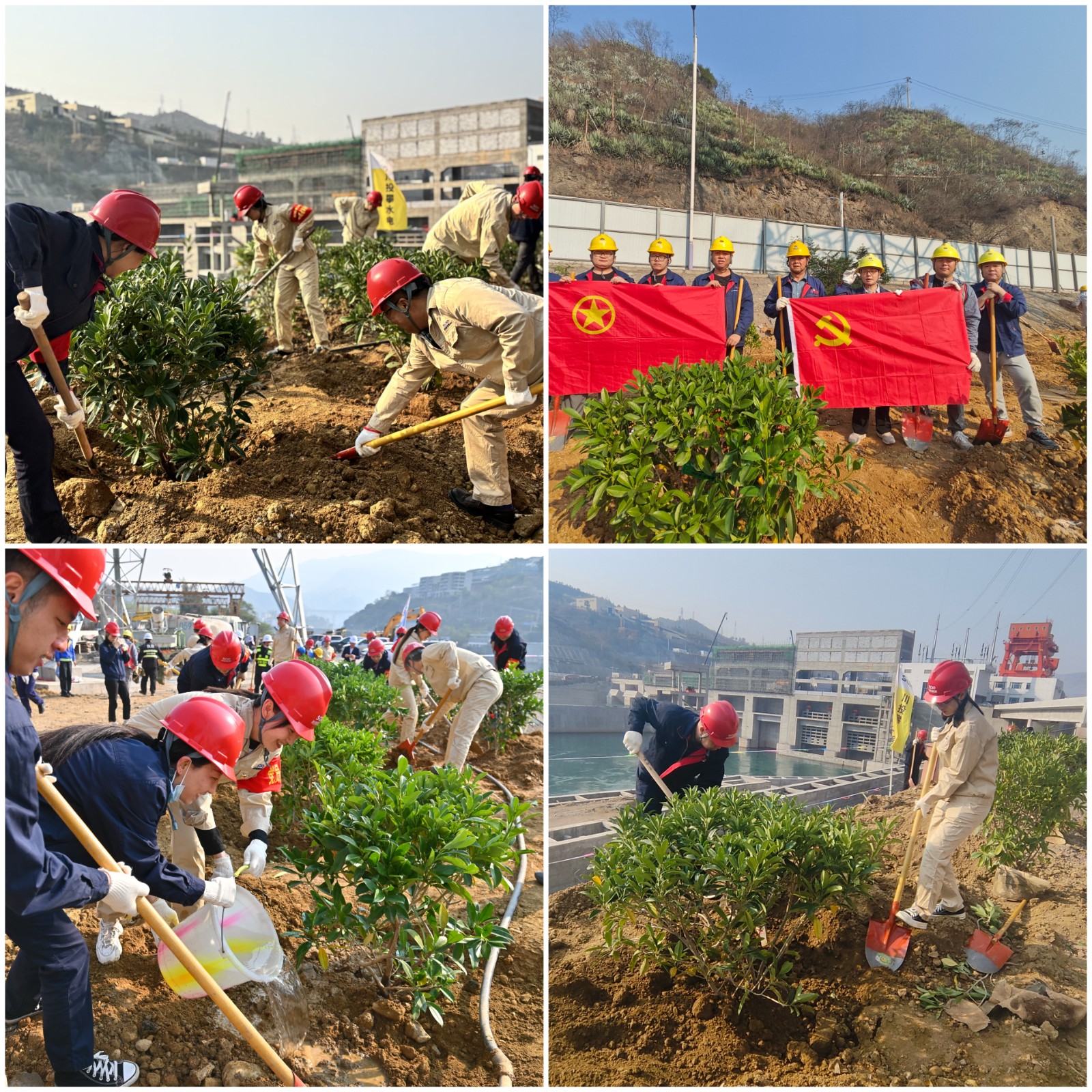 根據(jù)攀枝花氣候特點(diǎn),本次植樹活動(dòng)主要種植名為“非洲茉莉球”的常綠灌木,它具有耐曬、耐旱、耐炎熱等特點(diǎn),觀賞和藥用價(jià)值都很高,常常被看作是尊重和友誼的象征。參與人員熱情高漲,兩人一組、三人一隊(duì),紛紛拿起鐵鍬、水桶等工具投入到植樹行動(dòng)中,大家分工明確,配合默契,有的揮鍬鏟土,有的扶苗填坑,還有的提水澆灌,現(xiàn)場一片熱火朝天的忙碌景象,在大家的共同努力下,35棵樹苗在銀江水電站“安家落戶”。